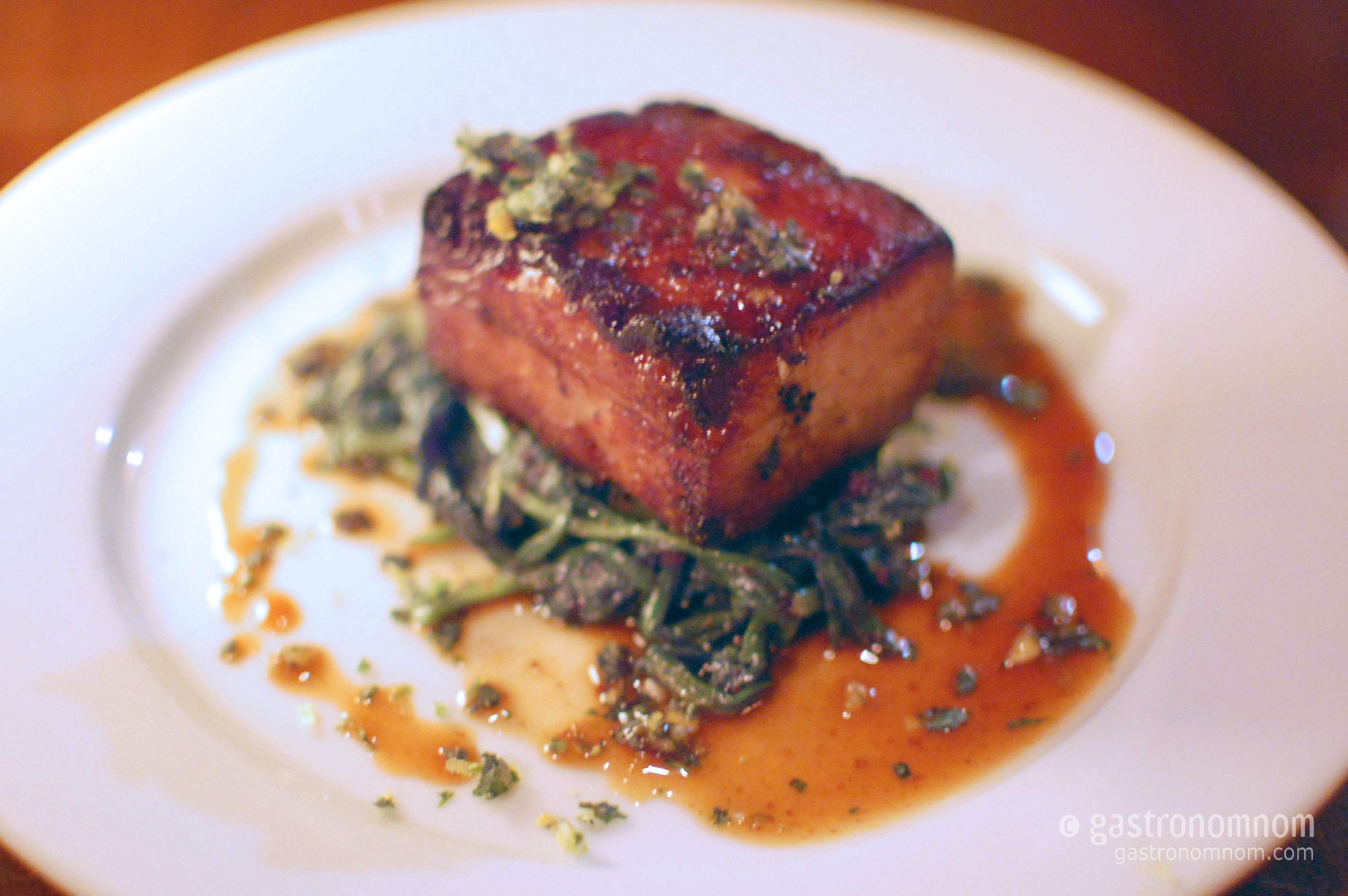 California pork belly, gastrique, chicharones, gremolata, bitter greens