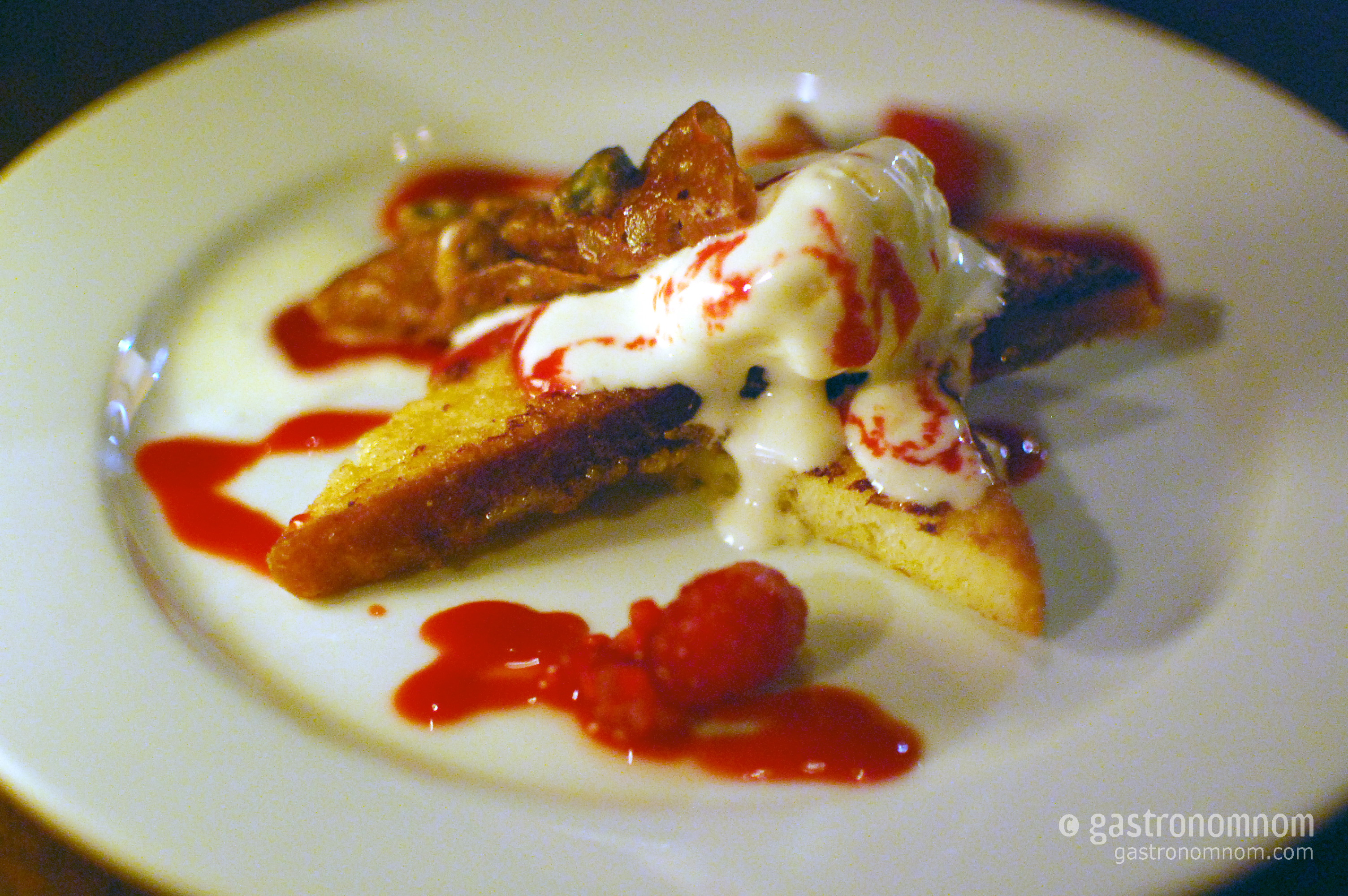 French Tickler | brioche French toast, honey & sour cream ice cream, pistachio tuille, raspberry syrup