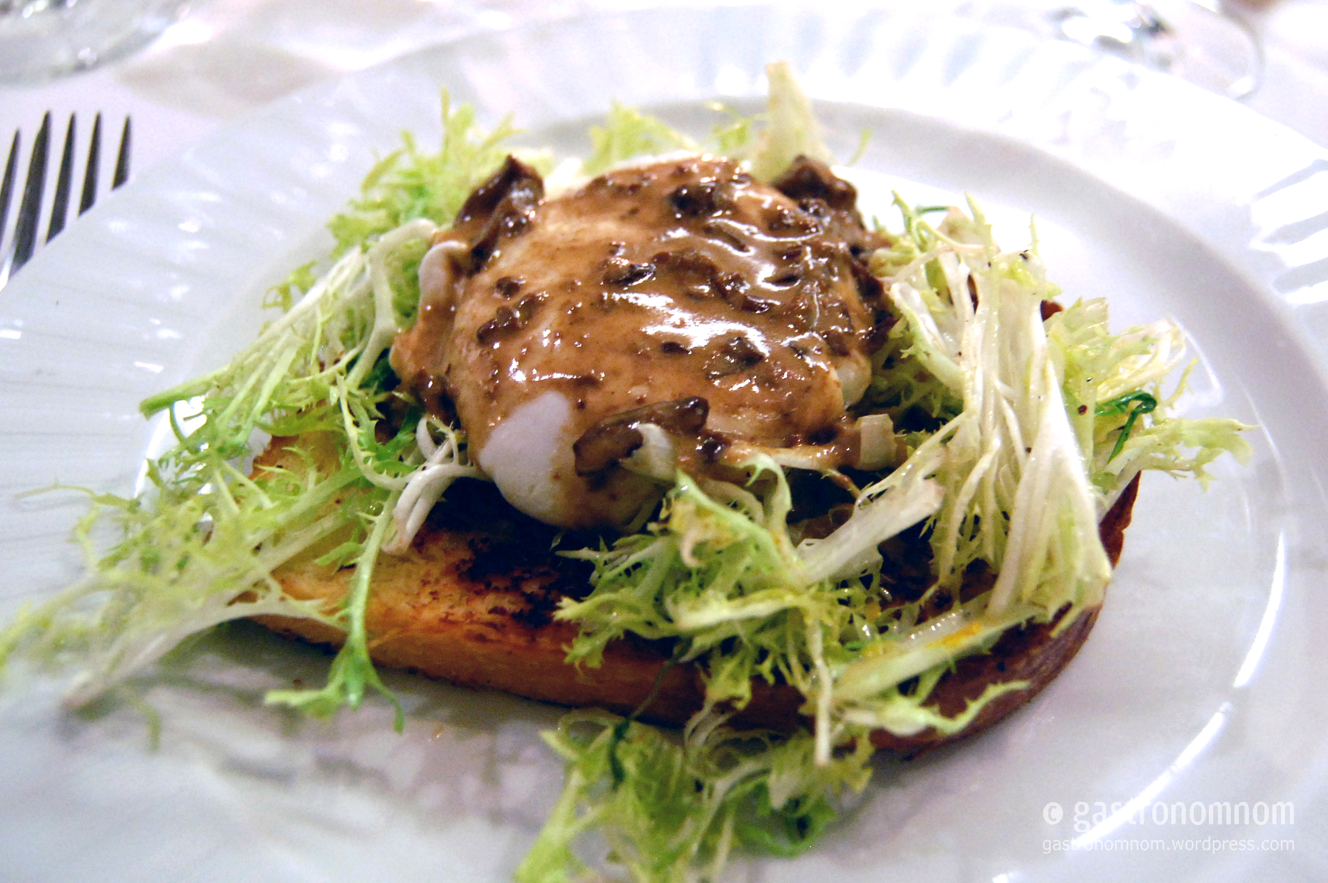 Let’s start with the appetizer. Poached egg with a porcini mushroom cream. Served on a slice of toast with some simple greens, this seems like an odd start to dinner.