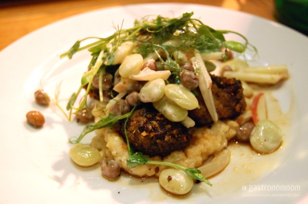 We followed that with, unsurprisingly, more deep fried meat. The fried rabbit livers with pepper jelly toast. Now, I’m a big fan of liver, mainly in the form of chicken livers, duck livers and, of course, foie gras. These rabbit livers were far more mild in taste than chicken or duck livers. Dressed with onion and cilantro and served on a thin slice of crispy pastry-like toast with a sweet pepper jelly, this was my favorite plate of the night. Again, a great interplay of fried crunch, gamey flavors and a sweet sauce.