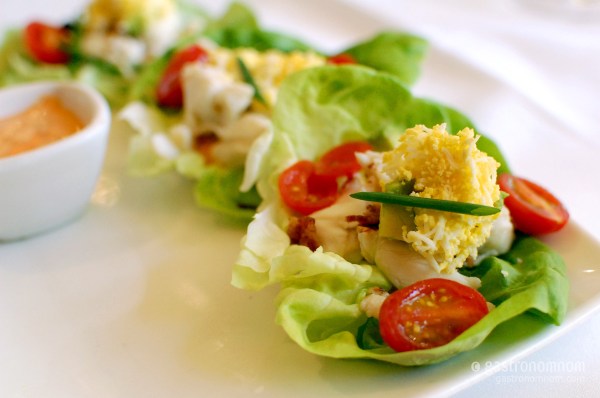 Lump Crab Louis Lettuce Wraps: butter lettuce, avocado, bacon, egg, tomato, chives. It’s a lettuce wrap, I’m a carnivore. Maybe I’d order this “for the lady”.