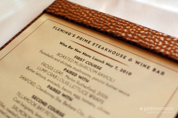 Now, I’ve always considered Fleming’s the epitome of the steakhouse. But in May of this year they tweaked their menu to offer smaller portion sizes of two “New Classics” (a porcini rubbed filet mignon and a peppercorn steak), two new seafood offerings (a Tillamook Bay petrale sole and a salmon nicoise salad), two new apps (roasted mushroom ravioli and lump crab lettuce wraps), and two new sides.