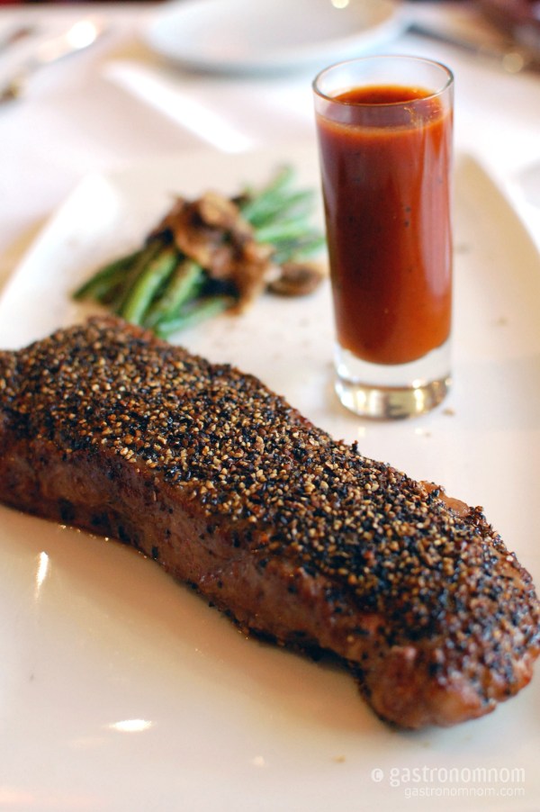 Peppercorn Steak. Prime New York strip, cracked black and white peppercorns, served with a shotglass of Fleming’s “F17” steak sauce. Served here with sauteed French green beans, shiitake mushrooms and porcini essence. Classic steakhouse fare kicked up with a great, spicy steak sauce. Big, bold flavors. We’ve left salad and seafood territory far behind here.