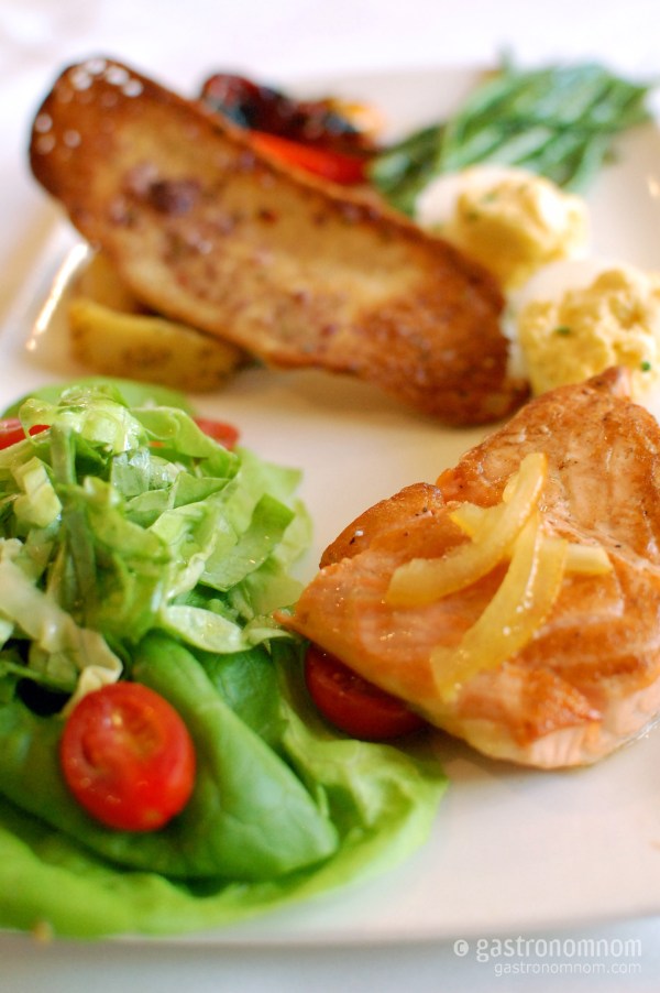 Salmon Nicoise Salad. A filet of Scottish salmon, truffled deviled eggs and individually prepared vegetables, topped with a kalamata olive aioli on a rosemary crostini. Pretty much a deconstructed nicoise salad.