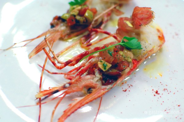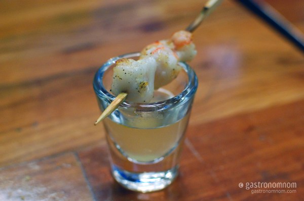 To whet our appetites for our around the world trip, the amuse bouche was a deconstructed shrimp cocktail. Essentially a skewered grilled shrimp atop a shot of ceviche sauce, which provided the acid.