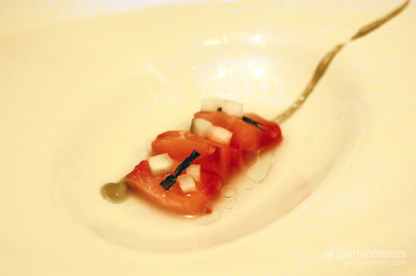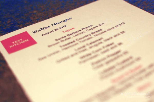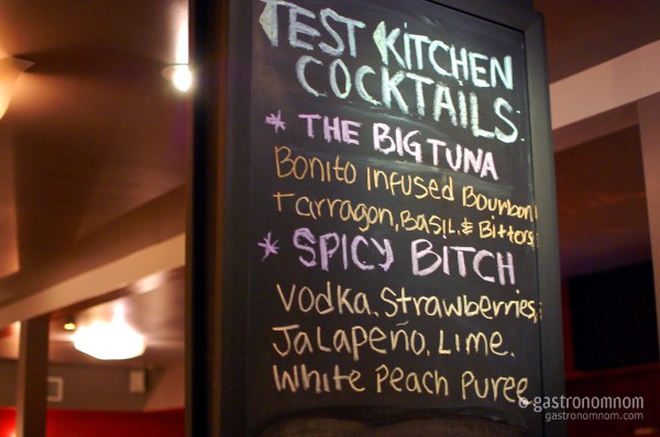 Let me say upfront that this night was marred by service difficulties. I knew Test Kitchen had become even more crowded since my initial visit so I was prepared for a wait at the bar. But after waiting an hour, I checked with the hostess only to find that someone else had been seated in my reservation. Ok, I understand the preponderance of Asian food bloggers in the room toting DSLRs but still, please don’t confuse someone else for The Gastonomnom!