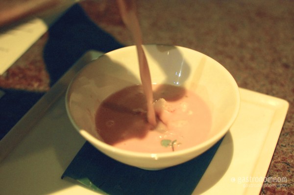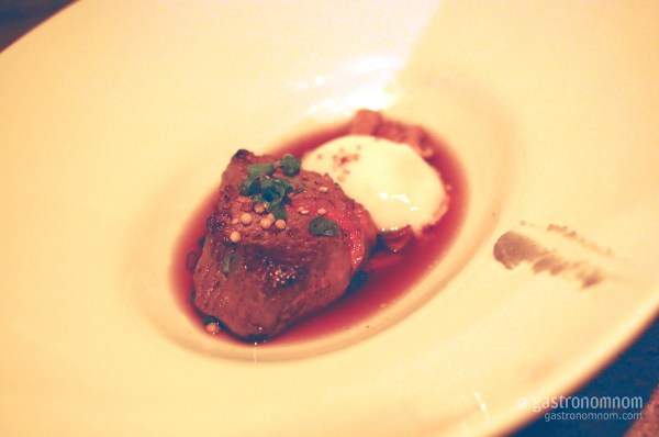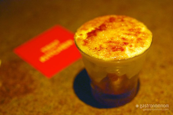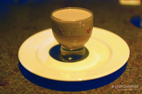 His lobster custard reminded me of the lobster and langoustine custard I had at L’Atelier de Joel Robuchon last year. Rich with the essence of lobster, texturally smooth like custard, this was like eating lobster without chewing. All the taste without the effort, if you will. Absolutely delicious. An unnamed upcoming Test Kitchen chef stopped by our table to chat and couldn’t help but run his finger through our finished cup (at our urging) to taste it.