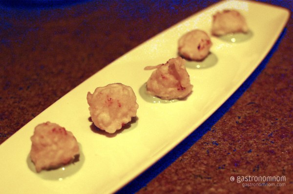 Once we were seated, we started with a couple of items from the tapas menu. This was a change from my previous Test Kitchen meal. Besides Chef Manzke’s five course tasting at $52 (a higher price point than the previous two chefs at $40), there were also six tapas items available a la carte either at the bar or with dinner. I had tried his Santa Barbara Spot Prawns at Hatchi and his Sea Urchin toast at Church & State, and the Calamari had run out, so we ordered the White Corn Fritters and Lobster Custard.