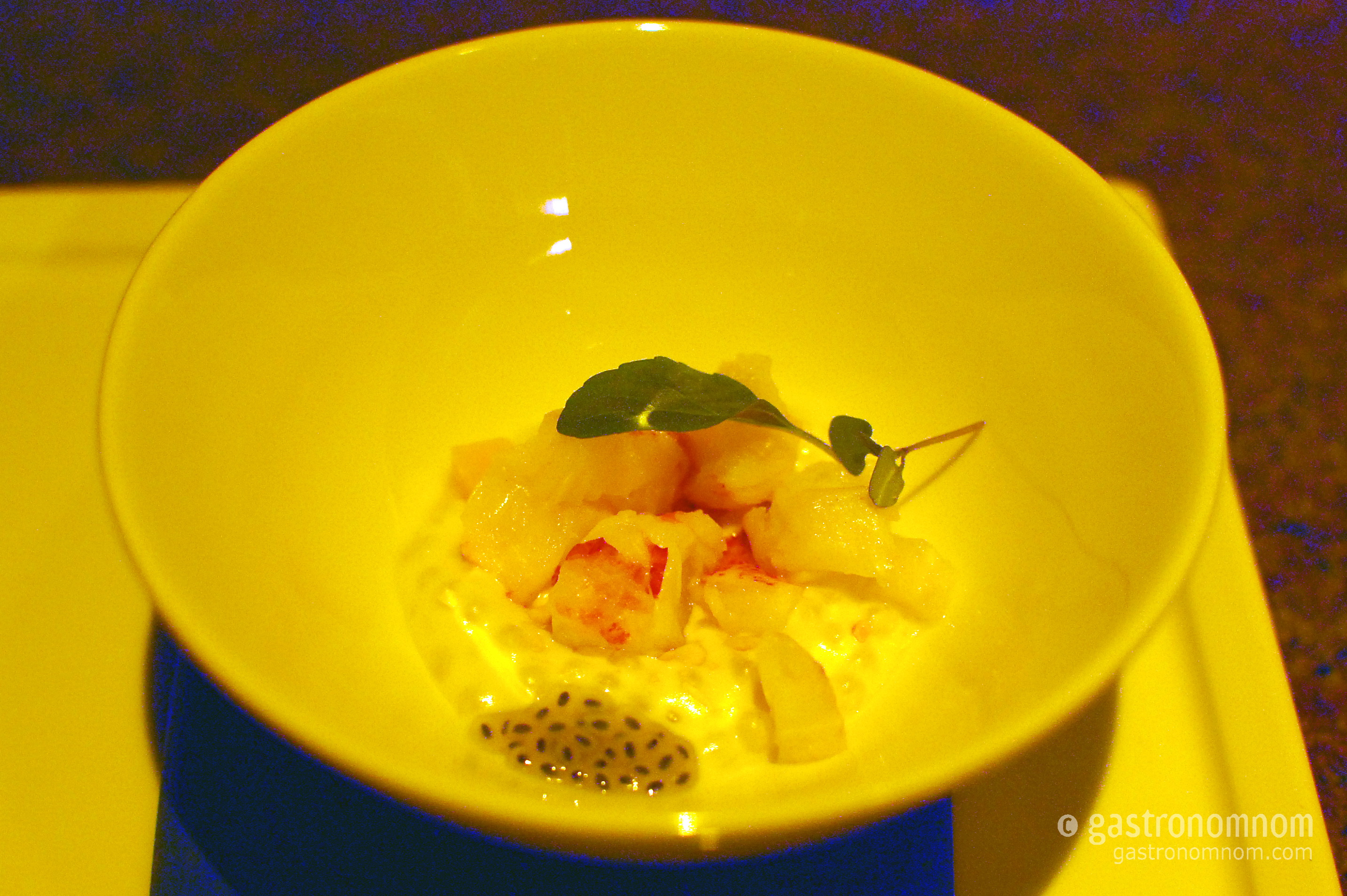 Springy chunks of Maine lobster tail, coconut tapioca and thai basil seeds in the bottom of a bowl with the curry-coconut soup served tableside. The lobster had plenty of snap, the Thai soup immediately reminded me of many Thai meals, and the tapioca balls added texture and starch to the dish. A comforting, aromatic, flavor packed dish and even more successful than his white corn curry soup with mussels and coconut tapioca that I praised at Hatchi.